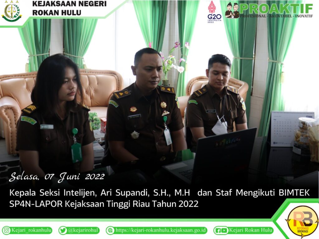Post Bimbingan Teknis SP4N-LAPOR June 7, 2022 No Comments Pages: 1 2 Previous Post Next Post You may also like October 19, 2022 Pertemuan dan Pemaparan Satgas Saber Pungli Provinsi Riau July 18, 2022 Apel Pagi Kejaksaan Negeri Rokan Hulu November 15, 2022 Vicon In House Training (IHT) Terkait Pemberian Fasilitas dan Penanganan Kredit Bermasalah Leave a Reply Cancel replyYour email address will not be published. Required fields are marked *Comment * Name * Email * Website Save my name, email, and website in this browser for the next time I comment. Δ