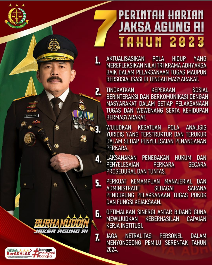 Post 7 Perintah Harian Jaksa Agung RI Tahun 2023 July 28, 2023 No Comments Previous Post Next Post You may also like November 7, 2022 Apel Pagi Kejaksaan Negeri Rokan Hulu September 26, 2022 RAKERNIS Bidang PIDSUS Kejaksaan RI Tahun 2022 April 17, 2023 Vicon Kunjungan Kerja Jaksa Agung Republik Indonesia Leave a Reply Cancel replyYour email address will not be published. Required fields are marked *Comment * Name * Email * Website Save my name, email, and website in this browser for the next time I comment. Δ