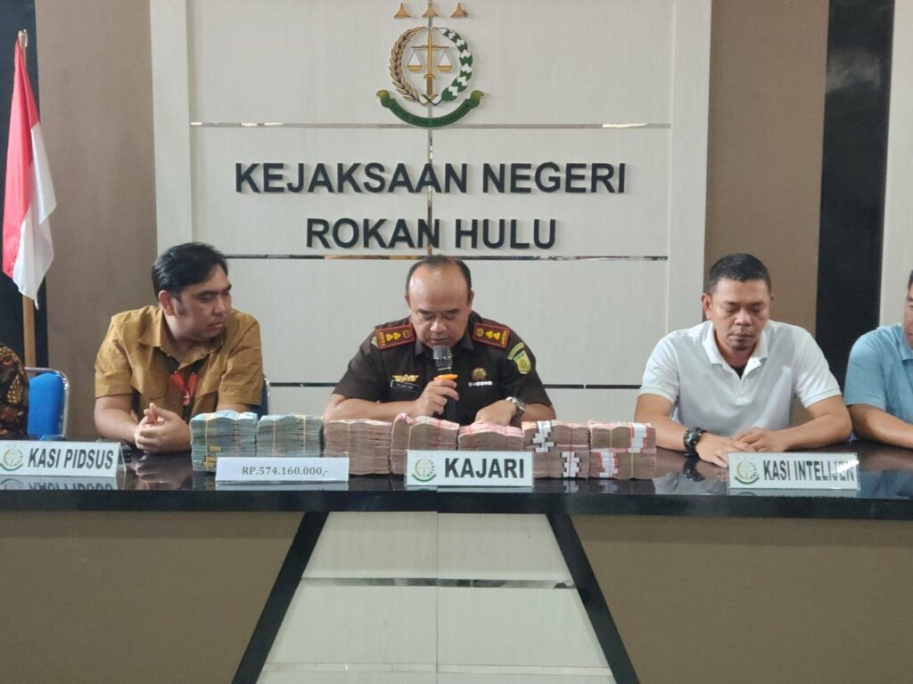 Telah menerima uang senilai Rp.574.160.000,-(lima ratus tujuh puluh empat juta setarus enam puluh ribu rupiah), Uang yang diterima tersebut akan dititipkan rekening Kejaksaan Negeri Rokan Hulu melalui BANK BRI Pasir Pengarian.