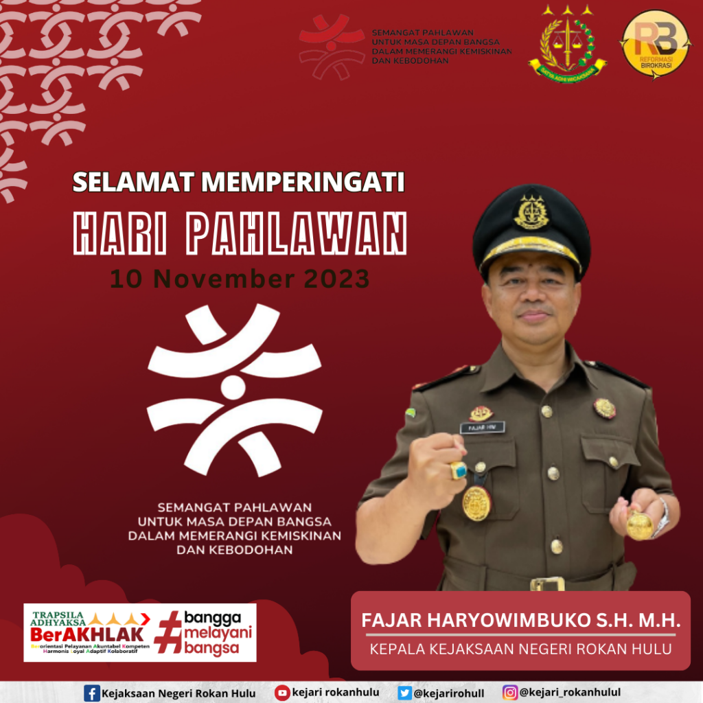 Uncategorized Selamat Memperingati Hari Pahlawan 10 November 2023 November 10, 2023 No Comments “SEMANGAT PAHLAWAN UNTUK MASA DEPAN BANGSA DALAM MEMERANGI KEMISKINAN DAN KEBODOHAN” Previous Post Next Post You may also like May 6, 2024 Kejari Rokan Hulu Gelar Upacara Peringatan HUT PERSAJA ke 73 Tahun 2024 April 1, 2024 Berbagi Takjil atau Makanan Berbuka Puasa Dalam Rangka Bulan Suci Ramadhan September 28, 2025 Laporan Kinerja Tahun 2025 Leave a Reply Cancel replyYour email address will not be published. Required fields are marked *Comment * Name * Email * Website Save my name, email, and website in this browser for the next time I comment. Δ